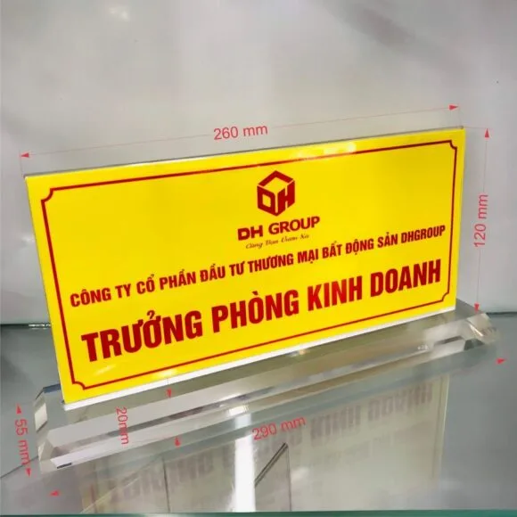 Kích thước bảng tên để bàn thường được thiết kế theo các size phổ biến như 20×8 cm, 25×10 cm và 30×12 cm.